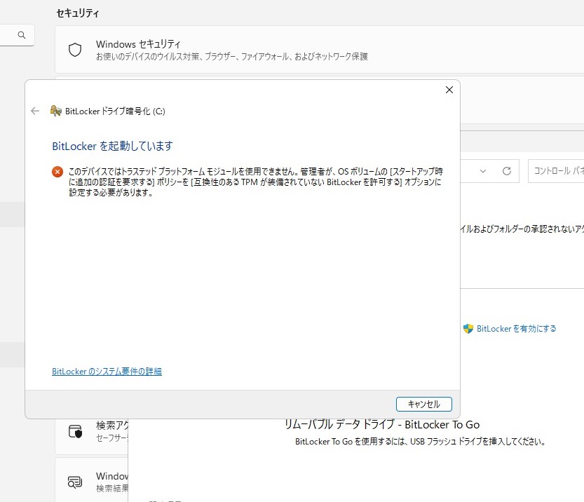 やっぱりTPM(トラステッドプラットフォームモジュール)を使用できませんと表示されました。
