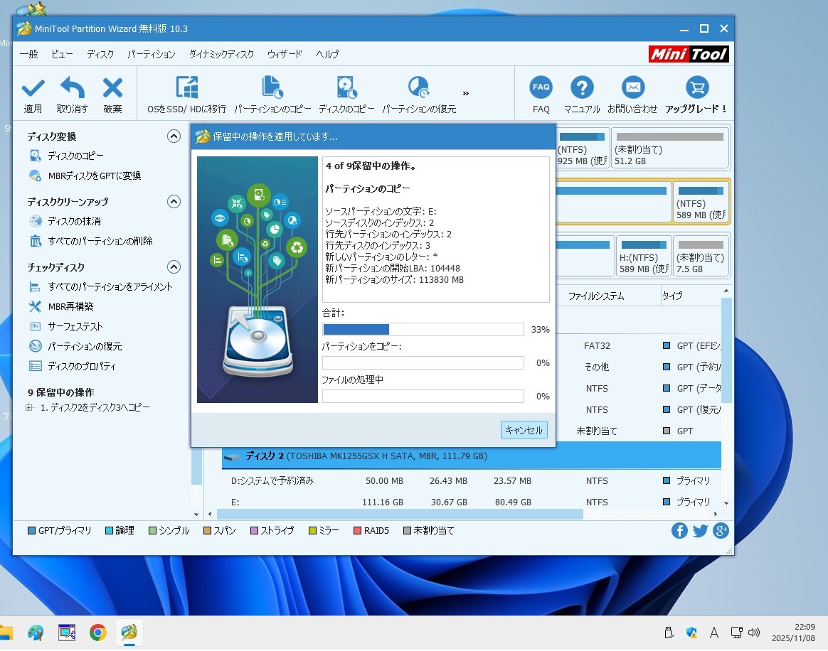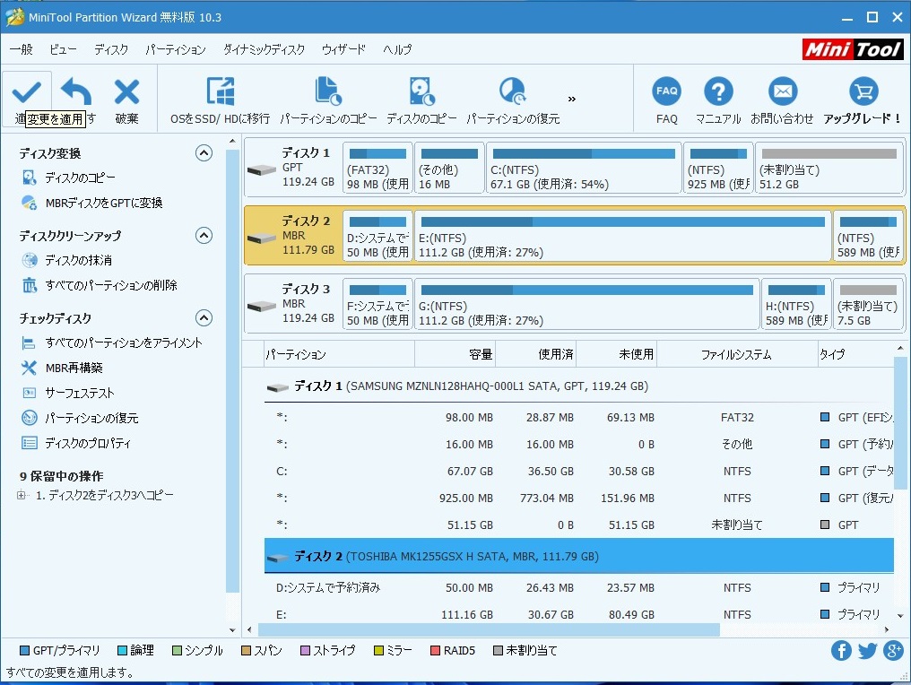 左側の「保留中の操作」のところに「1.ディスク2をディスク3へコピー」と表示されます。