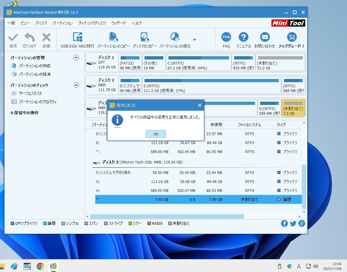 その状態でWindows11を立ち上げてPartition Wizardを起動します。