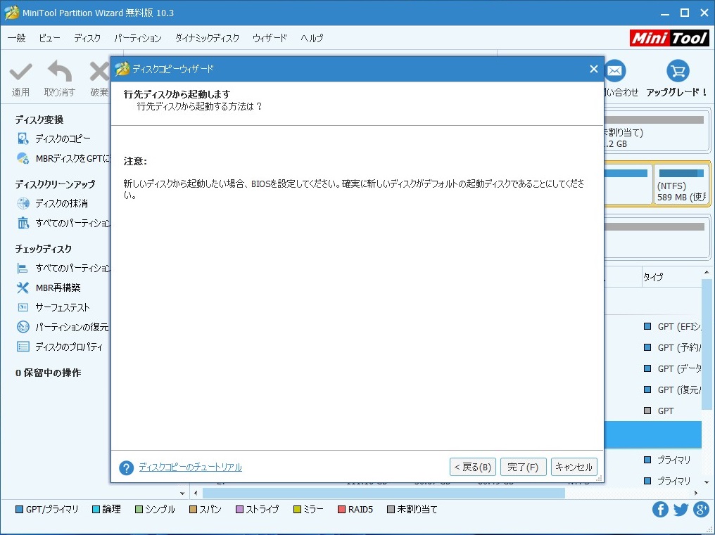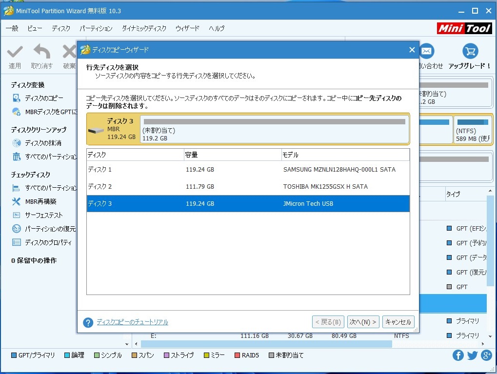 ここで元のディスクよりもサイズが大きいディスクをコピー先にしたときにパーティションのサイズを大きくすることもできますがそれは慣れてからの「応用」にしたほうがよいでしょう。