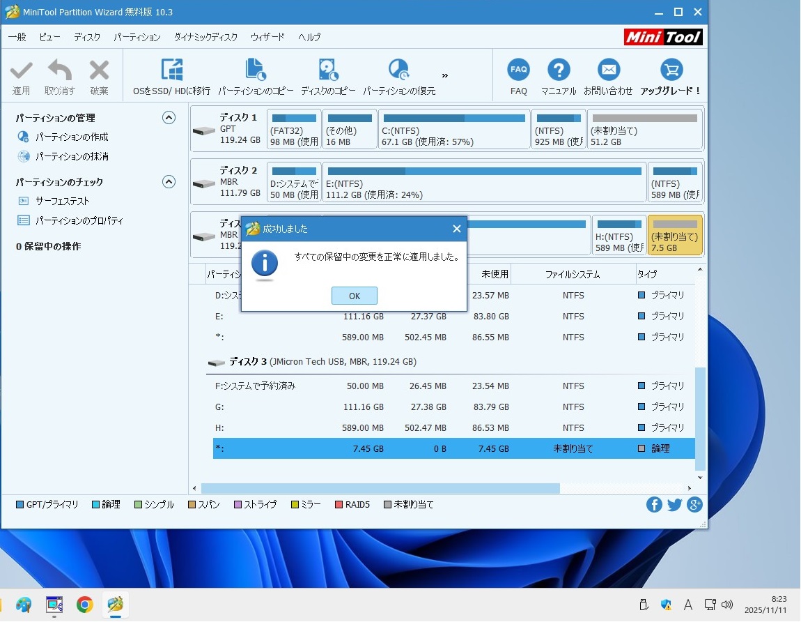 前回はWindows11デスクトップパソコン上でPartition Wizardを起動してノートパソコンのシステムディスク(2.5インチHDD)から2.5インチSSDにコピーしてクローンディスクを作成しました。