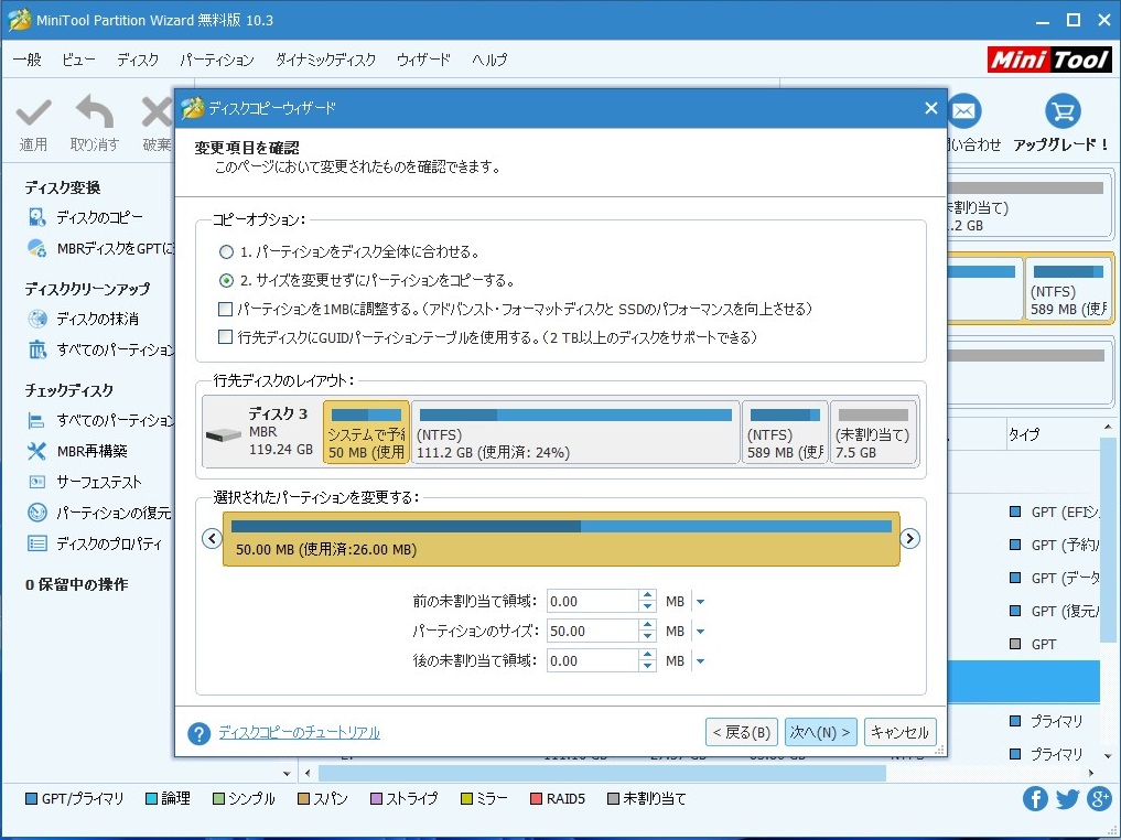 今回は「変更項目の確認」のところで「パーティションを1MBに調整する」にチェックは入れません。