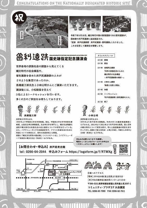 ■HOT NEW!! ■曽利遺跡が国史跡になることが決まりました! 6月20日に、曽利遺跡が史跡井戸尻遺跡に追加され、 「史跡井戸尻遺跡群 井戸尻遺跡 曽利遺跡」となることが決まりました。 秋ごろの官報告示で正式に国史跡となる予定です。 文化庁HP(https://www.bunka.go.jp/koho_hodo_oshirase/hodohappyo/94228001.html)