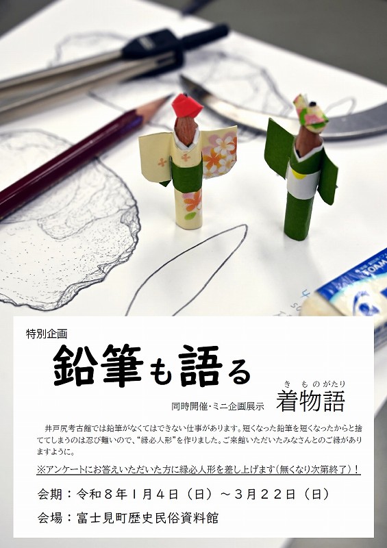 ■特別企画「鉛筆も語る」&ミニ企画展示「着物語」 会場:歴史民俗資料館 展示室 期間:令和8年1月4日(日)〜3月22日(日) 井戸尻考古館では鉛筆が無くてはできない仕事があります。短くなった鉛筆を、 短くなったからと捨ててしまうのは忍び難いので“縁必人形”を作りました。ご来館 いただいた皆さんとのご縁がありますように。 ※アンケートにお答えいただいた方に縁必人形を差し上げます! (無くなり次第終了) 縁必人形には着物を着せましたので、同時開催のミニ企画展示として「着物語」 を開催します。 職員の家で代々受け継がれてきた着物などを展示しています。親から子へ、そ して孫の代まで・・・。みんなの思いも一緒に受け継がれていくのは素敵ですよね。 みなさまのお越しをお待ちしております。 【学芸員Sのひとり言】 鉛筆を使う仕事というのは、実測図の作成です。特に石器の実測では線の種類によって濃さを変えています。 外形線はHB、剥離は2H、フィッシャーは4Hなど・・・。職員によっては鉛筆のメーカーまでこだわります! ちなみに、大変申し上げにくいのですが、私はホルダーペン派です・・・。 | ![]() |