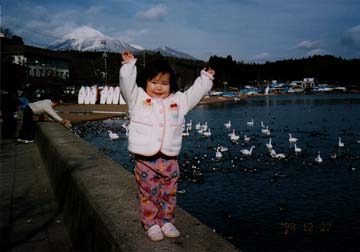 会津磐梯山と白鳥をバックにばんだ〜い!