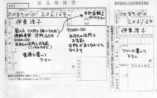 郵便振替を利用される方は、下記のように記入して手続きして下さい。定額小為替の方が使いやすい方は小為替で構いませんが、宛名カードを同封して下さいね。