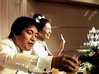 ![]() 鶴の形に折られたナプキンに喜ぶ新婦と誰も注ぎに来てないのにビールをがぶ飲みする新郎。 |